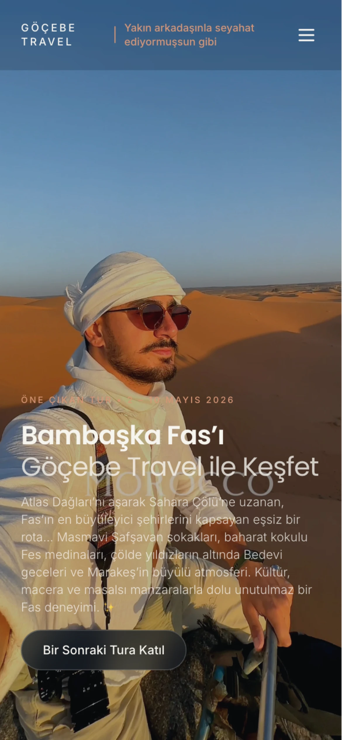 Göçebe Travel, Batın Özen tarafından yönetilen, özenle kurgulanmış grup turları düzenleyen Türkiye merkezli bir seyahat firmasıdır. Rusya Kuzey Işıkları, Japonya, Etiyopya gibi sıra dışı destinasyonlara sınırlı kontenjanla, kişisel rehberlik eşliğinde özel tur programları sunmaktadır. Proje başladığında firmanın yalnızca sosyal medya varlığı bulunmaktaydı. Bize düşen görev; hem ziyaretçiye yönelik etkileyici bir vitrin hem de tüm iş operasyonunu dijital olarak yönetebilecek bir sistem inşa etmekti.